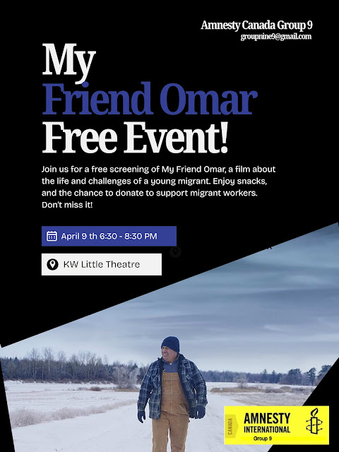 A film screening and discussion of a documentary that raises awareness of the abuses faced by temporary foreign workers in Canada. Presented by Amnesty International Group 9. Admission is free.